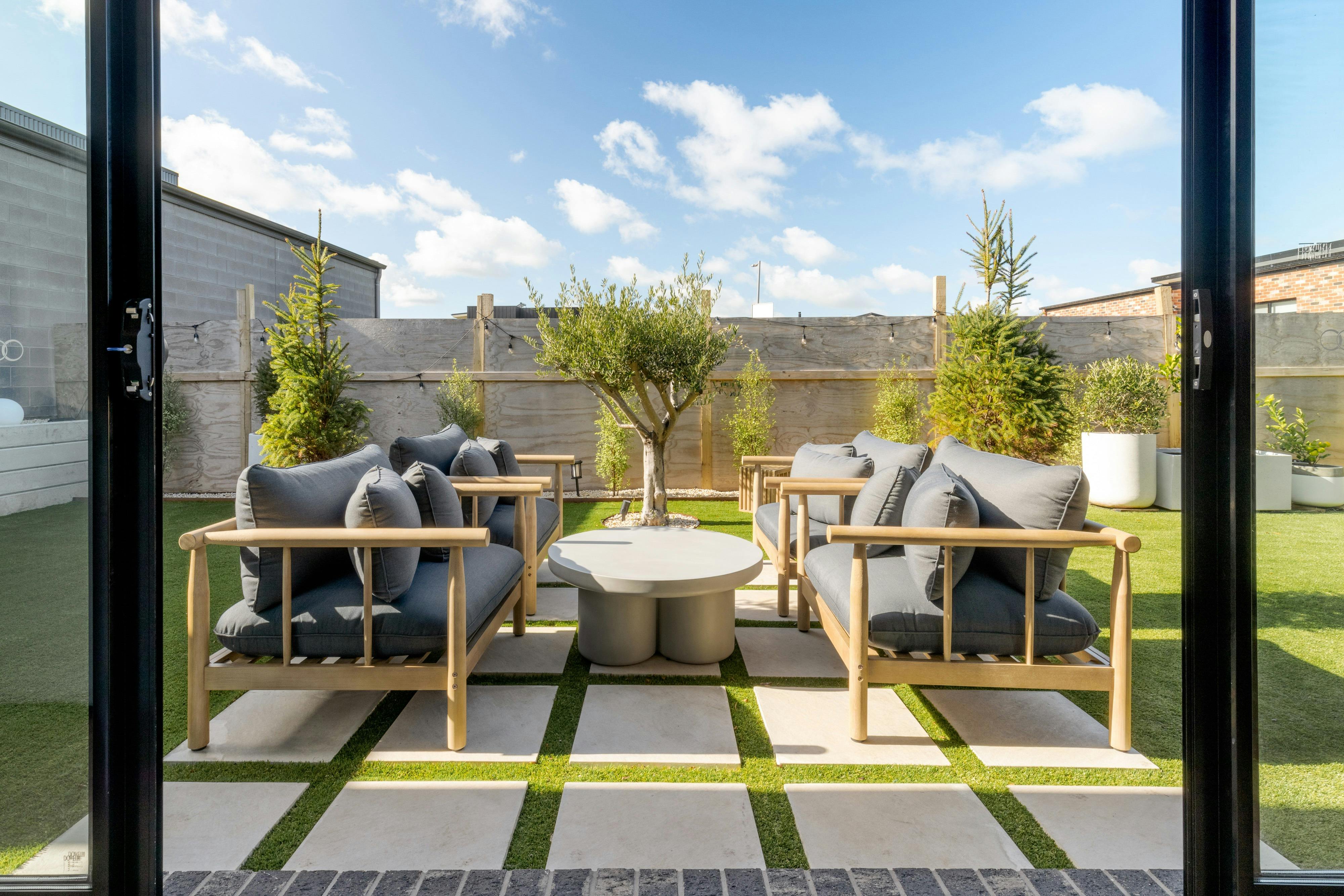 The outdoor entertainment area features an 85-year-old Olive tree with mood lighting and music to match the tempo of the guests moving around the outdoor space.