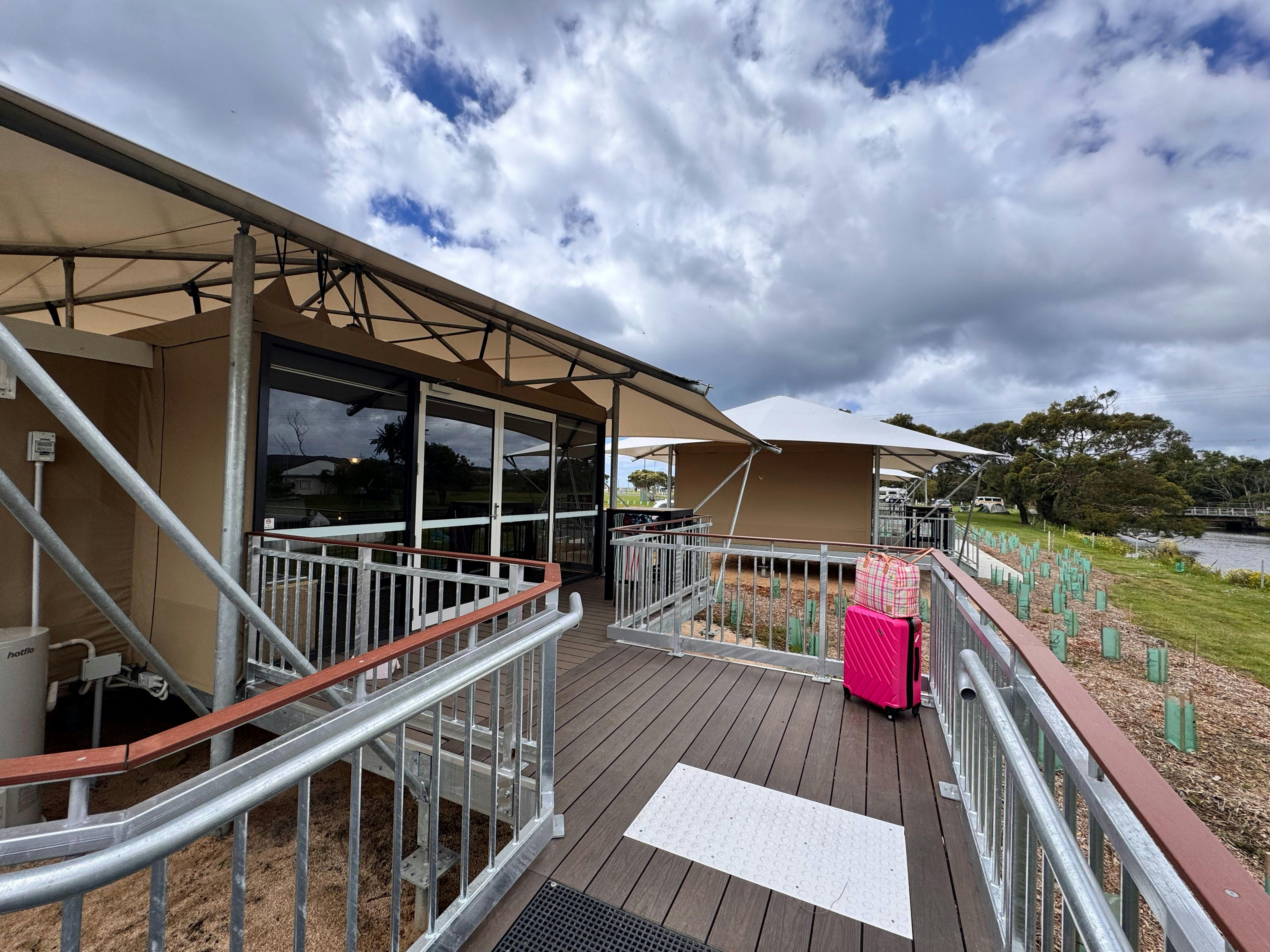The River Haven with Ensuite tent includes accessibility features of a ramp, accessible furniture and the private ensuite is DDA-compliant.