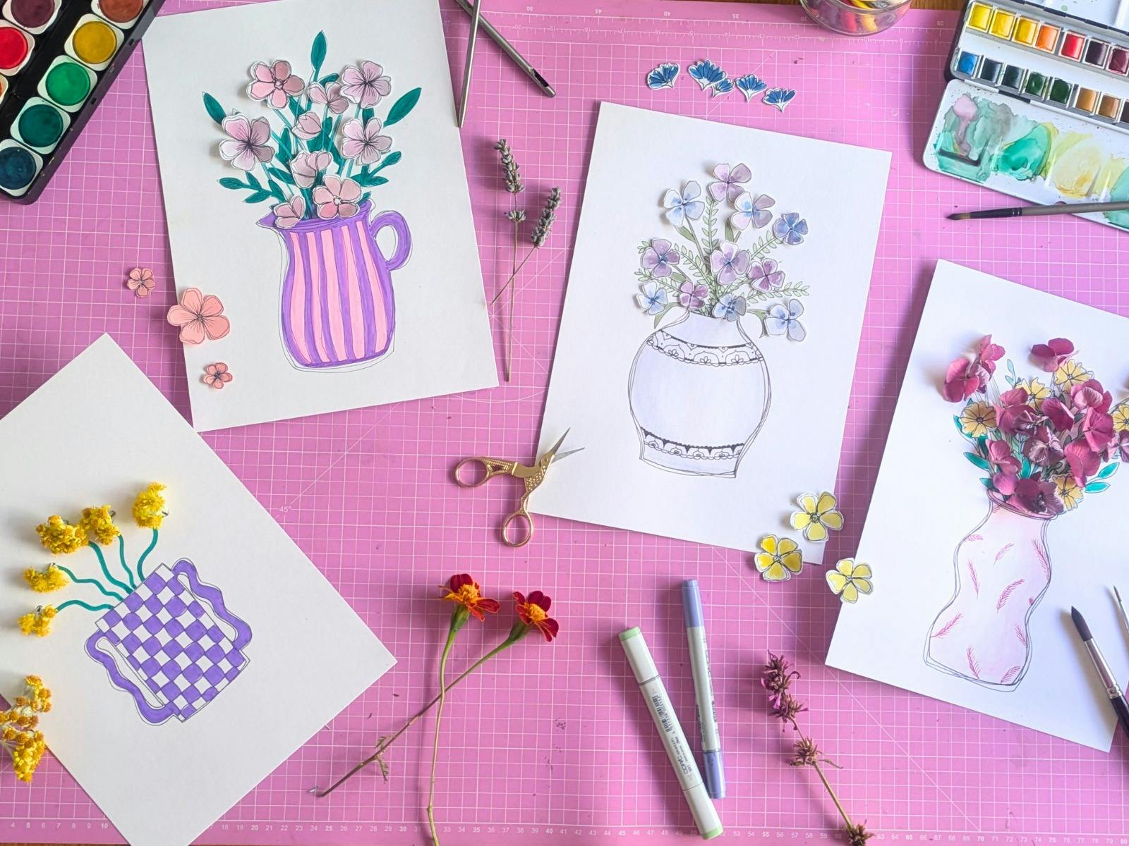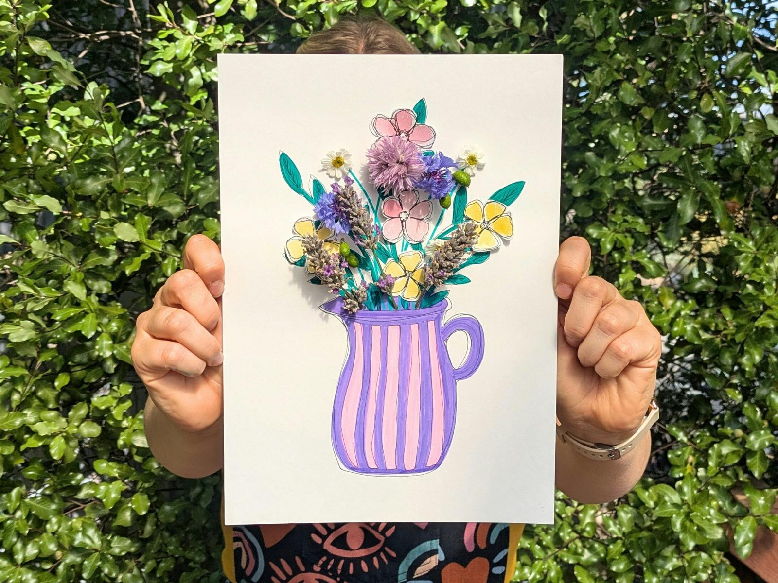 Learn beginner-friendly painting and drawing techniques to create mixed media artworks, incorporating real flowers you can pick yourself, if you like.