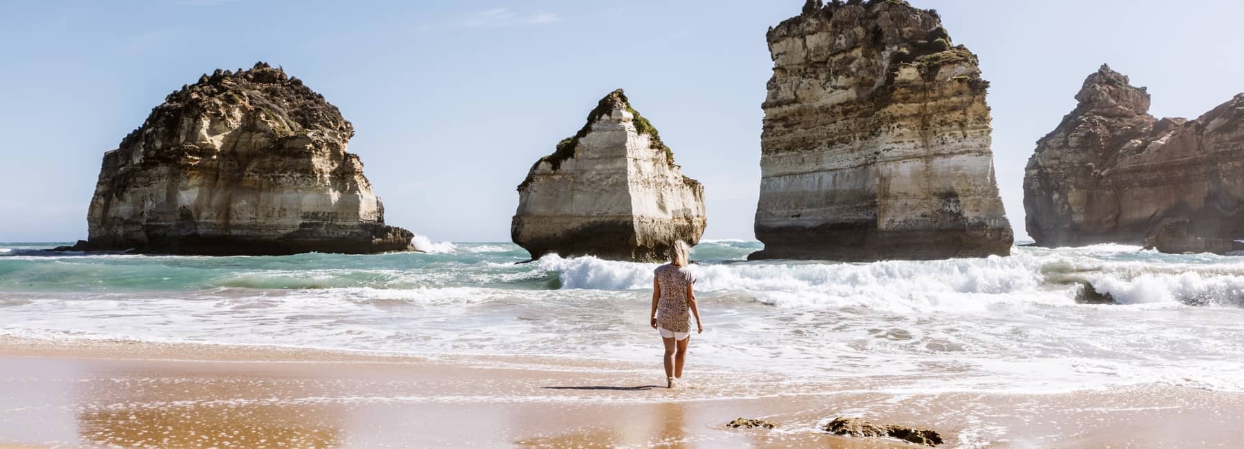 The Bay of Islands is an irregular, semi-circular bay that faces south-west and has several large sea stacks or islands dotted about the bay, together with rocks and reefs. Most of the Bay Shore is made up of steep, 10 to 20 m high limestone bluffs. However, tucked in the eastern corner of the bay and right next to the bend in the Great Ocean Road, is a gorge containing a 70 m long beach. The beach is used for boat launching and there is a steep ramp and steps descending from the bluffs to the beach. The beach itself is narrow, with deep water offshore, particularly at high tide. The reefs filter out most waves, with usually calm conditions at the beach.For more information, current conditions and patrol dates, visit the Beach Safe website